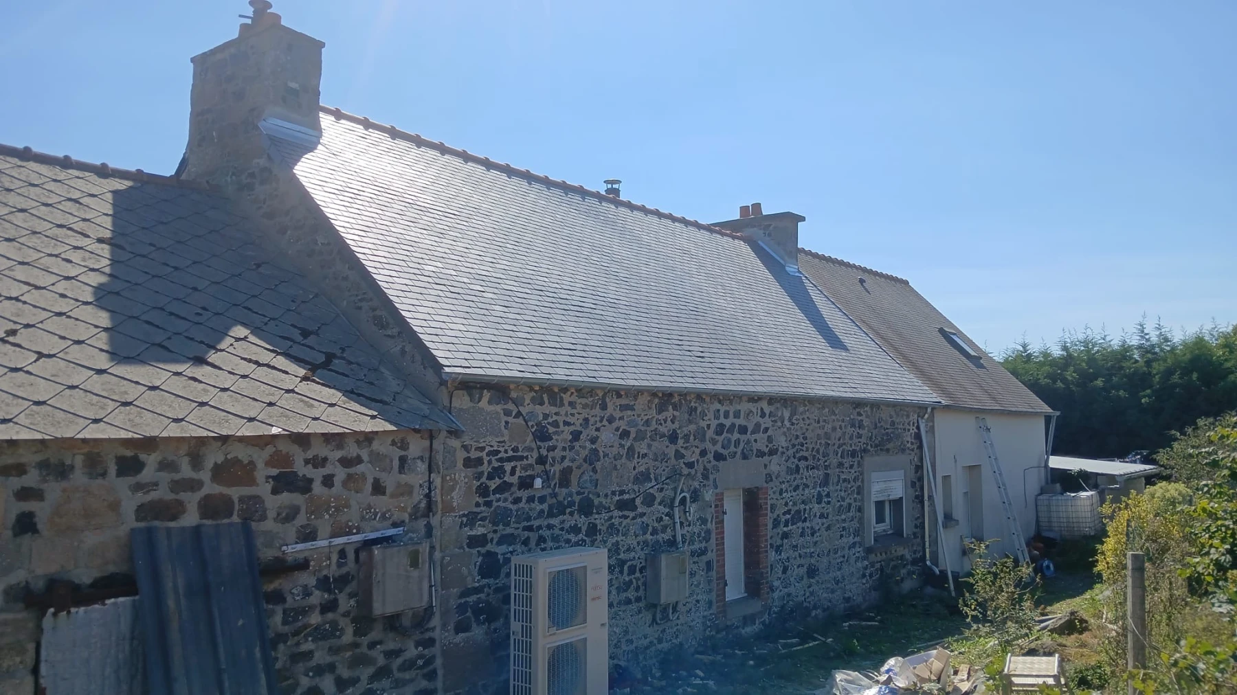 Mise en place d'un échafaudage et d'un monte charge pour facilité l'accès la manutention des matériaux lourds comme les ardoises, tout en réduisant les risques d’accidents.