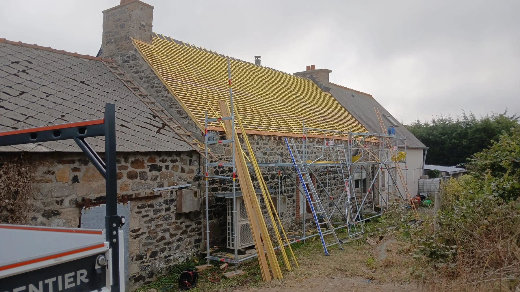 Démontage et à l’évacuation de l’ancienne toiture et de l’ancien faîtage. Cette opération permet de repartir sur une base saine, sans résidus pouvant fragiliser la nouvelle couverture.